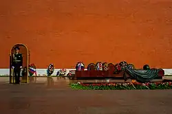 The Tomb of the Unknown Soldier (Russian: Могила Неизвестного Солдата, IPA: [mɐˈɡʲilə nʲɪɪˈzvʲɛsnəvə sɐlˈdatə]) is a war memorial in the Alexander Garden in Moscow near the Kremlin dedicated to the Soviet soldiers killed during World War II. It was designed by architects D. I. Burdin, V. A. Klimov, Yu. R. Rabayev and sculptor Nikolai Tomsky.