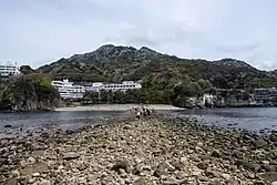 Tombolo begins at Hamase Beach on Dogashima and extends to Elephant Island and Nakano Island of the Sanshiro Islands.[2] A small canal cuts off Tombolo between Elephant and Nakano Island.[2] The tombolo is 250 meters long and 30 meters across at low tide between March and September.[3] Rather than being sandy, the tombolo is stoney, with the rocks often covered by seaweed and slippery to walk on.[3]