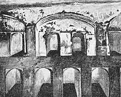 Inside are four burial chambers on two levels.[6] The largest chamber, just inside the entrance, contains 13 arched loculi (burial niches) arranged on two tiers,[7] one atop the other, with arcosolia dividing the niches into pairs.[2] Each niche measures 50 centimetres (20 in) by 60 centimetres (24 in).[15] A further 9 burial niches are located in a second chamber off the first, and 10 to 12 more niches can be found below-stairs from the main chamber in a chamber on the second level.[7] A fourth chamber on a third level appears as an independent entity with its own entryway.[17] The burial niches are arranged differently in each chamber, although each chamber is designed with an eye to symmetry.[17] All told, there are 63 burial niches in the tomb, along with several cubicles and niches for bone collection.[14] Stone ossuaries were found in rock-cut vaults within the complex.[15]