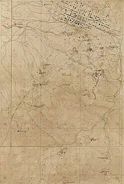 When the first claims were filed, the initial settlement of tents and wooden shacks was located at Watervale, near the Lucky Cuss mine, with a population of about 100.[15] The Goodenough Mine strike occurred shortly after. Former Territorial Governor Anson P. K. Safford offered financial backing for a share of the mining claims, and Schieffelin, his brother Al, and their partner Richard Gird formed the Tombstone Mining and Milling Company and built a stamp mill near the San Pedro River, about 8 miles (13 km) away. As the mill was being built, U.S. Deputy Mineral Surveyor Solon M. Allis finished surveying the new town's site in March 1879.[16] The tents and shacks near the Lucky Cuss were moved to the new town site on Goose Flats, a mesa above the Goodenough Mine at 4,539 feet (1,383 m) above sea level and large enough to hold a growing town. Lots were immediately sold on Allen Street for $5.00 each. The town soon had some 40 cabins and about 100 residents. At the town's founding in March 1879, it took its name from Schieffelin's initial mining claim. By fall 1879, a few thousand hardy souls were living in a canvas and matchstick camp perched amidst the richest silver strike in the Arizona Territory.[15]