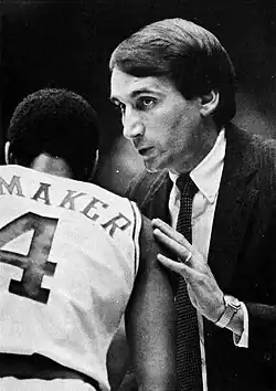 Dawkins played point guard for the 1982–83 Blue Devils, but moved to shooting guard the following year to make way for Amaker.[7] When Amaker joined the 1983–84 Blue Devils, unranked Duke, led by Dawkins and Amaker, won its first seven games, the longest winning streak of fourth-year head coach Krzyzewski's career. Amaker had a field goal accuracy of over 65 percent in those games.[8] He led Duke to the NCAA Tournament during his 1984 freshman and 1985 sophomore seasons, but neither team advanced to the Sweet Sixteen (regional semifinals).[9][10] In the quarterfinal round of the 1984 ACC men's basketball tournament against the Mark Price-led Georgia Tech Yellow Jackets,[11][12] Amaker hit the game-winning shot with the score tied and less than 10 seconds left in overtime. In some instances, Amaker's defense changed the game by limiting dribble penetration and forcing low shooting percentages regardless of whether he had notable offensive contributions.[13]