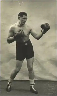 Davies was back at the Queensbury Club in Soho exactly a month later, with another fight against welterweight champion Ernie Roderick. Again Roderick took Davies the full distance and was again awarded the decision. Just four days later Davies was in Wolverhampton, where he stopped Charlie Knock via technical knockout in the eighth round. Then on 26 April, two days after the Knock fight, Davies was back in London, at the Royal Albert Hall for a return bout against Hawkins. The eight round fight went the distance, and this time the referee gave Hawkins the decision. The fight was close enough for a second rematch to be arranged with Davies' corner claiming their fighter was tired after the recent two fights. Davies still believed he was a contender for the middleweight title.[7] It took three months for the return bout to take place, and although not billed as a contender eliminator, for Davies a loss would affect his claim at a title shot. The fight took place on 17 July 1943 in Birmingham, and the fight again went the full distance, and again the decision went to Hawkins.[8] Davies didn't fight again until December, when he beat Johnny Clements at Willenhall. He then started 1945 poorly, losing for the first time to 'Satan' Flynn on their fifth encounter, at the Alexandra Theatre in Stoke Newington on New Year's Day. That January Davies married his partner Phyllis.[9]