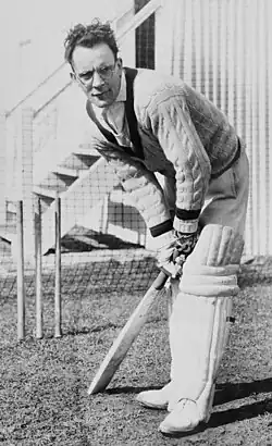 Mitchell was born at Creswell, Bolsover, Derbyshire and was a faceworker in the coal mines. He was first spotted by Derbyshire during the General Strike of 1926[1] and began playing for Derbyshire in the 1928 season but was disappointing. However, in the 1929 season he took fifty wickets in his first eight matches and was selected for "The Rest" in a Test trial against England,[2] ultimately topping 100 despite a later decline. In the 1930 season, he did even better and was the season's third-highest wicket-taker behind only incomparable county bowlers Tich Freeman and Charlie Parker. In 1931, Mitchell achieved the amazing feat of taking twelve wickets for thirty runs against a strong Sussex eleven – featuring that brilliant player of spin bowling Duleepsinhji at his best – on a pitch too wet to take much spin.[3][4] Although expensive during the remainder of the 1931 and 1932 seasons, Mitchell's ability to spin the ball on dry pitches more than any other leg-spinner in county cricket[5] saw him taken on the Ashes tour (in preference to the likes of Freeman) when business prevented Walter Robins touring.[6] He played in the Fourth Test as a replacement for Bill Voce who was injured, and despite dismissing Bill Woodfull in both innings he was never able to establish himself for England. Indeed, he was so expensive when called upon in 1934 that he took no wicket and conceded 117 runs, and the following year, when he was very disappointing on a leatherjacket-infested Lord's wicket that should have helped him, he is quoted as having said "You couldn't captain a team of bloody lead soldiers" to his captain Bob Wyatt.[7] Indeed, Mitchell's tactlessness towards administrators made him quite unpopular with them and may have prejudiced his chances of doing well in representative cricket.