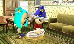 Tomodachi Life is set in real-time and encourages players to play at different times of the day to observe different interactions with islanders. Over time, the islanders will interact and develop friendships with each other at random intervals. If two islanders of the opposite gender and similar age interact, one can confess their love to the other, which, when successful, sets them as their "Sweetheart", or "Special Someone" in the European version. This can lead to marriage between the two islanders after further interactions.[4] Eventually, if a married couple is on the island and the player allows the feature, the player will receive a phone call from either the mother or the father, informing them that they had a baby, and allowing them to name it and edit its face. After this, the married couple can ask the player to babysit the child, which will start a minigame that changes depending on the child's age. After the child grows up, the player can either move them to the apartments or send them off via StreetPass to appear on other players' islands as an explorer.[5]