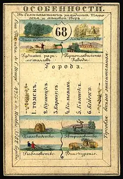 Animal husbandry developed.[8] In the Biysk Uezd, deer (mountain deer, Cervus maral) are bred.[12] Beekeeping played an important role, although it was carried out very irrationally. Part of the bee products is sent to the Irbit Fair. In addition to apiary beekeeping, there is also honey hunting.[12] Fisheries also developed.[8] Fishing is the main occupation of inorodtsy and partly of Russians.[12] Hunting and birding is in decline due to an increase in population, forest fires and the merciless extermination of animals and birds.[12] Of the birds, mainly the hazel grouse comes into trade.[12]