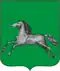 In a green shield is a silver horse with scarlet eyes and a tongue. The shield is surmounted by the Imperial crown and surrounded by golden oak leaves connected by the ribbon of St. Andrew.