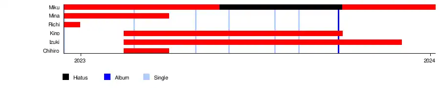 On February 15, 2023, Kino, Izuki and Chihiro joined the group.[3] They released the digital single, "Have a Nice Day", on February 26.[4] On April 3, Mina and Chihiro withdrew from the group.[5] They released a second digital single, "Tonai Girl's", on May 1.[6] On May 26, Miku went on hiatus due to a worsening chronic health condition.[7] A third digital single, "Like or Love", was released on June 5,[8] followed by a fourth digital single, "Cotton Candy Story", on July 23,[9] and a fifth digital single, "Ice Cream no Hoshi", on August 17. Their first album, Where Are You Going?, was released on September 27.[10] On October 1, Kino graduated from the group and Miku resumed activities.[11] Izuki graduated from the group on December 2.[12]