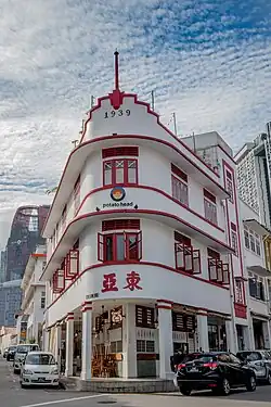 The Tong Ah Eating House was established in the triangular three-storey building by Tang Chew Fue in 1939. The building is known for its "distinctive red-and-white facade and shape" and is a local landmark.[1] In July 2013, the building, which was then owned by a relative of the eating house's current owner, the great-grandson of Tang, was sold to a foreign investor. The eating house then moved into nearby 35 Keong Saik Road as a result of the sale.[2] Its last day of operations within the building was on 14 July.[3]