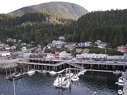 Tongass Narrows is defined as the water body that extends from the Revillagigedo Channel to the Gravina Island in Clarence Strait.[1] It is shaped as a "Y", split into two channels by Pennock Island.[2] At its northern end is Clarence Strait. In the southeast it extends from Nichols Passage to Guard Island. The eastern side is bounded by Revillagigedo Island and the west by Gravina Island.