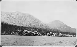 The eastern side of the narrows includes the cities of Saxman and Ketchikan.[2] Ketchikan International Airport is located on Gravina Island. The channel extends in a generally northwest direction for about 14 miles (23 km). About 0.625 miles (1.0 km) westward of East Clump islet, the width of Tongass Narrows is 0.125 miles (200 m), the shoal water on the north side extending out 900 feet (270 m) from the high-water mark. In mid-channel, the depth is from 15 to 26 fathoms (27–48 metres (89–157 ft)). The north shore of Tongass Narrows is steep and heavily wooded. The south shores are low, flat, and wooded, with occasional open ground for 1–2 miles (1.6–3.2 km) back, where the land rises to the California Ridge.[3]