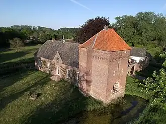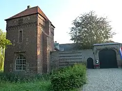 The big tower was the gatehouse of the bailey of the old castle. It is dated to the late 14th century, that is the same as the oldest construction found on the grounds of the main castle.[3] The current castle is square, and had a gate in its southern wall. The west wing probably dates from the 18th century. Its foundations use the same brick as the former gatehouse, but this could be reuse. The north wing probably also dates from the 18th century, but takes the place of older buildings. The age of the east wing is unknown. The southern wall is oldest, and still contains walled up embrasures. There were also buildings along this wall. In the 19th century one still had to cross a drawbridge to enter the castle.[4]