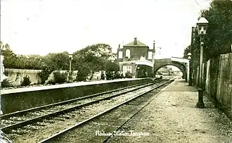 Tongham station, along with Farnborough (Main), was one of the first railheads for the military traffic associated with the recently established army camps at Aldershot.[4] Its significance was drastically reduced, both as a station and as part of a through route, with the opening of Aldershot railway station in 1870 on a new more direct line from Pirbright Junction on the London to Basingstoke line which linked with the Guildford to Alton line between Tongham and Farnham, effectively bypassing the short section.[5] This was followed in 1879 by the laying of a spur from Ash to Aldershot which had the effect of diminishing the Guildford to Farnham traffic.[6]
