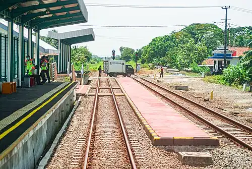 This station has two railway tracks with track 2 being a straight line. There is land on the former line 3 which previously served as a badug and a save route, and line 3 is connected to a branch line that leads to Bojonegara Port.