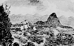 The vessel landed at the Falkland Islands on 4 December to make repairs and take on water supplies, with a suitable source of freshwater located at Port Egmont.[24] Captain Thorn set sail on 11 December without eight of the men, including partner David Stuart, Gabriel Franchère and Alexander Ross.[3][4] Having only a rowboat, the eight men spent over six hours rowing before they caught up with Tonquin.[3][4] Robert Stuart quickly threatened Thorn to stop the ship, saying if he refused then "You are a dead man this instant."[4] This display made Thorn order the Tonquin crew to sail back and pick up the stranded crew. Thorn's actions led to increasing tensions between him and the employees of the Pacific Fur Company. Communication between company workers was no longer held in English to keep the captain excluded from discussions. Company partners held talks in their ancestral Scottish Gaelic and hired PFC workers used Canadian French. The atmosphere of "their jokes and chanting their outlandish songs" greatly frustrated Thorn.[4] On 25 December, Tonquin safely traversed around Cape Horn and sailed north into the Pacific Ocean.