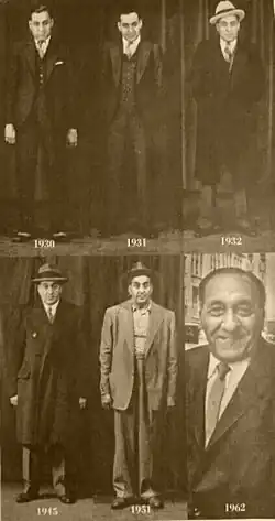During Prohibition, Accardo got the nickname "Joe Batters" after using a baseball bat to murder three mobsters who had betrayed the Outfit.[4] Capone was allegedly quoted as saying, "Boy, this kid's a real Joe Batters". In 1939, Chicago newspapers dubbed Accardo "The Big Tuna", after a fishing expedition to Wedgeport, Nova Scotia, Canada where Accardo caught a giant 400 pound tuna and was famously photographed with his catch.[5][4] In later years, Accardo boasted over federal wiretaps that he participated in the infamous 1929 St. Valentine's Day Massacre in which, allegedly, Capone gunmen murdered seven members of rival Bugs Moran's North Side Gang. Accardo also claimed that he was one of the gunmen who murdered Brooklyn gang boss Frankie Yale, again by Capone's orders to settle a dispute. However, most experts believe Accardo had only peripheral connections, if any, with the St. Valentine's Day Massacre and none whatsoever with the Yale murder, which was most likely committed by Gus Winkler, Fred Burke, and Louis Campagna. However, on October 11, 1926, Accardo may have participated in the assassination of Northside gang leader Hymie Weiss near the Holy Name Cathedral in Chicago.[6]