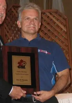 As part of the reforms conducted by CSL Commissioner Cary Kaplan the Vaughan Shooters became inaugural members of the International Division, and were renamed the Italia Shooters in 2006.[15] Throughout the season De Thomasis undertook the coaching duties, and claimed the organizations first championship title, and was recognized by the league with the Coach of the Year Award.[16][17][18] In 2010, he received the Harry Gauss Memorial Award for his continual allegiance, commitment and support to the league.[19] In 2017, he managed York Region to their second championship title.[20]