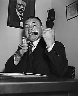 On June 28, 1939 in Yankee Stadium in the Bronx in New York City, Galento fought for the heavyweight championship of the world against the 'Brown Bomber' Joe Louis. Louis was a heavy favorite and "1 to 8 in the betting".[67] In a prefight poll conducted by the Associated Press, only three sportswriters picked Galento to win.[68] 34,852 attended and the gate amounted to $333,308.[69] Famous and otherwise notable attendees included Tyrone Power, Gene Tunney, Jack Benny, Mary Livingstone, Andy Devine, New York Governor Herbert H. Lehman, and "head G-Man" John Edgar Hoover.[70] NBC broadcast the bout and crowds gathered around radios all across the United States.[71][72][73] Galento secured his title shot via a run of good form—a string of eleven straight victories—and the promotional skills of his manager Joe Jacobs: a "ballyhoo wizard."[74] Fernandez writes that Galento "looked and sounded like a Damon Runyon character", and Jacobs—who had Galento pose for the press "smoking cigars while punching the bag", "downing full pitchers of beer", and "carrying kegs of beer to 'enhance his training'", all the while repeating "I'll moider da bum" in his "thick New Joicey accent"—"made him even more so."[75] With his "carefully built picture of a fat, lazy man who never trained except on endless cigars and gallons of beer", the Derry Journal's "Roundabout in Sport" recollected in 1963, "Galento climbed the contenders' ladder more because he was the best publicity man in the business than because he was the best fighter."[76] In light of Galento's well-publicized antics, the Woman's Christian Temperance Union, though it regarded prize fighting as "anti-social", indicated its preference for the "clean-living Louis creed as opposed to the self indulgence of Galento and his beer kegs."[77]