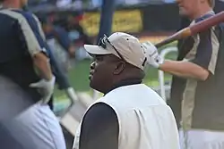 Gwynn's father encouraged his sons to play ball in the makeshift baseball field that he assembled in their backyard.[14] The setup was a narrow strip of grass that was longer than it was wide.[14][20] Pulling the ball too much resulted in it being lost over the neighbor's fence, but left field being short ruled out hitting it to the opposite field.[14][16][20][21] Once the brothers' supply of wiffle balls was out, they resorted to using a sock rolled in rubber bands, a wad of tape, or a hardened fig from a neighbor's tree.[14] Gwynn could pull the ball in his backyard, but he would naturally hit it the other way during regular games.[21] Growing up, he attended Los Angeles Dodgers games and watched his hero, Willie Davis; the Dodgers outfielder had twice as many stolen bases as home runs (398 SB, 182 HR) in his career. Gwynn admired Davis for being black, left-handed, and "aggressive but under control"; he respected Davis's work habits as well.[22] Unlike other kids who tracked home run hitters, Gwynn checked the box scores in the newspaper every morning to follow high-average hitters like Pete Rose, George Brett, and Rod Carew.[23] By age thirteen, Gwynn had joined an adult baseball league.[24]