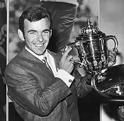 In early 1966 Jacklin made his second visit to South Africa.[26] The visit was more successful that his first, with a third place finish in the South African Masters and a joint victory in the Kimberley 4000 Tournament, to put him in 4th place in the money list with £903.[27][28][29] In 1966 Jacklin won the Blaxnit (Ulster) Tournament by 5 strokes and was runner-up in the Rediffusion Tournament in Jersey.[30][31] He finished 5th in the Order of Merit and won £2,715 on the circuit.[32] Jacklin was selected, together with Peter Alliss, for the England team for the 1966 Canada Cup in Japan, the pair finishing in 10th place.[33] He then travelled to New Zealand to play on the circuit there. He was runner-up in the Wattie's Tournament behind Bob Charles, and was a joint winner, with Charles, of the Forest Products Tournament.[34][35] He finished 5th in the prize money list with £905.[36] Jacklin stayed in New Zealand and won the 1967 New Zealand PGA Championship in early January, beating Martin Roesink by 6 strokes in an 18-hole playoff.[37] He then played in a few events in Australia, where he was joint third in the Victorian Open, before playing a number of events on the 1967 Far East Circuit, including a runner-up finish in the Thailand Open, before travelled to the United States to play in the 1967 Masters for which he had received an invitation.[38][39] Jacklin was tied for 7th place after three rounds but a final round 77 dropped him into a tie for 16th place.[40]