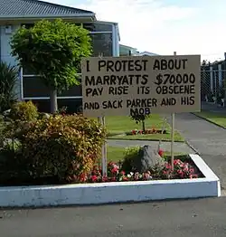 Maryatt's local government career was dogged by controversy. He was held responsible for the loss-making Hamilton V8 Supercars event by his opponents,[5] notably then-mayor of Hamilton David Braithwaite, who frequently clashed with Marryatt.[6] In late 2011 he, along with the Bob Parker-led Christchurch City Council, garnered controversy for accepting a $70,000 pay rise as the council's CEO.[7] This culminated in a protest rally attended by some 4,000 people in February 2012. In late August of that year, it emerged that Marryatt had taken a personal grievance against city councillors. Whilst the case was settled before it went to court, the city council reimbursed his legal costs, which were between NZ$10,000 to NZ$30,000.[8] Maryatt was also condemned by the Canterbury Employers Chamber of Commerce for his decision to grant council staff an extra 11 days leave a year without first seeking approval from elected city councillors.[9]