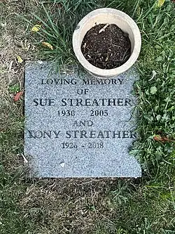 Streather married his wife Sue (nee Mary Huggan) in April 1956, and they had a daughter and three sons.[13] Streather lived in his later years in the village of Hindon, Wiltshire.[9] He died on 31 October 2018 at the age of 92. Sir Chris Bonington spoke at Streather's memorial service in Hindon Parish Church, and his ashes were interred in the churchyard.