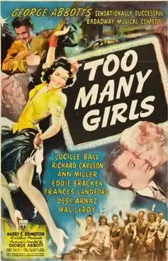 Too Many Girls is a 1940 American musical comedy film directed by George Abbott, who had also directed the hit Broadway musical on which it was based, which ran for 249 performances.[2][3] The film's screenplay is by John Twist, and it stars Lucille Ball, Richard Carlson, Ann Miller, Eddie Bracken, Frances Langford, Desi Arnaz and Hal Le Roy.