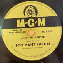 "Too Many Parties and Too Many Pals" is a song released by Hank Williams under the pseudonym Luke the Drifter. The song dates back to at least 1926 when it was recorded by a number of artists including the Bar Harbor Society Orchestra.[2] It had also previously been recorded and released in 1948 by Bill Haley as Bill Haley and the 4 Aces of Western Swing; this was Haley's first professionally released single.[3]