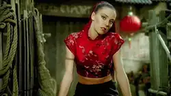 The music video for "Too Much" was directed by Howard Greenhalgh and filmed on 10 November 1997 in a studio located in London.[48][49] The video features each Spice Girl in their own individual scene, inspired by their own film fantasies.[50] Melanie Brown is shown singing on top of a tank strapped with ammunition in an industrial post-apocalyptic war scene in a segment based on the film Mad Max Beyond Thunderdome (1985). Emma Bunton is shown in a bedroom dressed in white pyjamas while objects float around her on their own; her scene is based on Poltergeist (1982). Melanie Chisholm is shown in a Chinatown, dressed in a red cheongsam and black pants with her hair in a long ponytail with red streaks; her scene is based upon Year of the Dragon (1985). Geri Halliwell is featured in a black-and-white scene based on Rita Hayworth's performance in Gilda (1946). She is shown performing on a smoky stage in a long, white sequined gown with a group of sailors dancing around her. Victoria Adams is shown in a missile silo next to a smoking rocket, clad in a black catsuit and with a long ponytail; she is portraying Catwoman from Batman Returns (1992).[49][50]