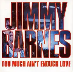 "Too Much Ain't Enough Love" is a song by Australian rock singer, Jimmy Barnes. It was released in October 1987 as the first single from Barnes' 1987 album, Freight Train Heart. It was his first Australian No. 1 hit single[1] and reached No. 4 on the New Zealand Singles Chart.[2] In the United States it was issued in the following year, which peaked at No. 91 on the Billboard Hot 100 in July 1988.[3] It featured back-up vocals by Venetta Fields (who often performed back-up for both Barnes and John Farnham), as well as Wendy Matthews, who later found acclaim as a solo singer.