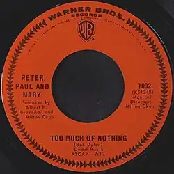 By November 1967, this song was a Top 40 hit for Peter, Paul and Mary.[1] According to Billboard, this version's "clever driving blues arrangement compliments the trio to the fullest."[6] Cash Box said that it is "blues in a folk manner with plenty of funk."[7] Record World described it as "philosophy with a gritty beat."[8] In Dylan's original, the chorus addresses two ladies—"Say hello to Valerie/Say hello to Vivien/Send them all my salary/On the waters of oblivion"—but Peter, Paul and Mary changed the second name to "Marion," displeasing Dylan. The trio's Paul Stookey speculated that this mistake may have caused Dylan to consequently become disenchanted with the group: "We just became other hacks that were doing his tunes."[9] Patrick Humphries notes that, whether by accident or design, the chorus's two women originally named share the names of the two wives of the major 20th-century poet T. S. Eliot.[10][a 1] Lachlan MacKinnon [11] writes that the lines do refer to Eliot's wives and are "remarkably shrewd", suggesting the poet's "strange combination of self-distancing and financial propriety". Peter, Paul and Mary's recording of the song was also included on their 1968 album Late Again.