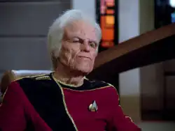 Writer Michael Michaelian originally pitched a story idea based on andropause, sometimes referred to as "male menopause".[1] He wrote a treatment and first draft script involving reverse aging. D. C. Fontana later explained that the terrorist MacGuffin (an ambiguous but central plot point) was not quite right. Fontana was brought in to overhaul the ending, and explained that a "lot of what I put in at the end was also in Michael's story and drafts, but approached with a different emphasis".[1] One significant alteration she made was to change the plot from involving actual terrorists to a trap that the crew must defuse.[1] The original ending also had the two opposing parties on the planet sit down for peace talks with Jameson surviving the effects of the de-aging drugs.[2] He would have been reduced in age to fourteen and could no longer remember his wife.[2][3]