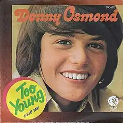 A version of "Too Young" by then 14-year-old Donny Osmond became an international top 10 hit for him, reaching number 5 in the UK and number 6 in Canada. It also spent eight weeks on the U.S. top 40, with a peak position of number 13[14][17] when released as a single (MGM catalog number 14407) in 1972.