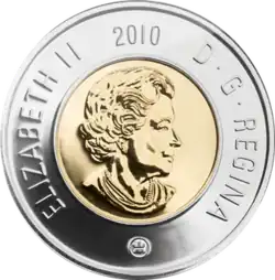 The toonie (also spelled twonie[1][2] or twoonie[3][4]), formally the Canadian two-dollar coin (French: pièce de 2 dollars canadiens, nicknamed deux piastres or deux piastres rond), was introduced on February 19, 1996, by Minister of Public Works Diane Marleau. As of 2025, it possesses the highest monetary value of any circulating Canadian coin. The toonie is a bi-metallic coin which on the reverse side features an image of a polar bear by artist Brent Townsend. The obverse, since 2023, bears a portrait of King Charles III. It has the words "Charles III / D.G. Rex"; before 2023, the words were in a typeface different than that used on other Canadian coins.[5]