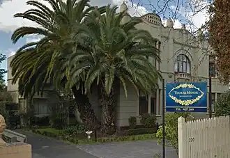Toorak Manor, previously called “Graeme”, in Williams Rd Toorak is a house of historical significance. It is a Victorian mansion built in the 1880s for Dr Frank Nyulasy, a prominent physician and surgeon of Melbourne. It was part of the Tashinny Estate owned by Charles Alexander Smyth who sold part of his property in 1885.[1] It is now a boutique hotel providing comfortable accommodation facilities.