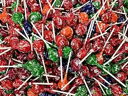 - Caramel Apple Pops – flat lollipop of apple-flavored hard candy, coated with a chewy caramel layer