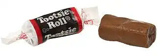 Tootsie Roll (/ˈtʊtsi/) is a chocolate taffy candy that has been manufactured in the United States since 1907. The candy has qualities similar to both caramels and taffy without being exactly either confection.[3] The manufacturer, Tootsie Roll Industries, is based in Chicago, Illinois. It was the first penny candy to be individually wrapped in America.[4]