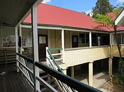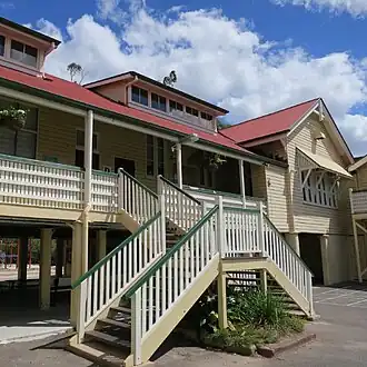 The building constructed on the new site in 1910 was a standard design (Type C/T2) by the Department of Public Works, which retained responsibility for schools until 2013. Under the Department's stewardship, and through the involvement of some of Queensland's most innovative architects, school buildings became more advanced and diverse. A period of marked experimentation in school design occurred between 1893 and 1914, with a primary focus on improving the natural light and ventilation of classroom interiors.[19] Various combinations of roof ventilators and ducting; ceiling and wall vents; and larger windows of varying sill heights and dormer windows were trialled. For timber-framed buildings, single-skin construction was favoured for its heat dissipation ability and economy. Often the building was lined on the interior rather than exterior, providing a smooth, cleanable surface that provided better interior light. The resulting externally-exposed stud framing was protected from the weather by wide verandahs, which had the added benefit of shading the building and providing makeshift teaching space. The introduction of highset buildings began in the late 1890s, providing better ventilation and additional teaching and covered play space underneath. This was a noticeable new direction and this form became a characteristic of Queensland schools.[20][1]