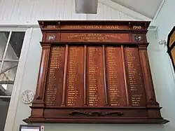 During World War I two additions were made to the school. A cedar honour board commemorating 115 former pupils and teachers who served during World War I was unveiled at the school in 1917 by EH Macartney MLA.[25] For the total cost of £30, Messrs Patterson constructed the board and H Barker completed the writing.[26] Now housed in the library (the 1880 Ferguson building), the honour board was the site of wreath laying at ANZAC Day commemorations.[27][1]