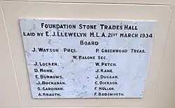 A ceremony to mark the laying of the foundation stone of the hall occurred on 23 March (the date of 21 March inscribed on the stone is incorrect). Local Labor MLA E J Llewelyn performed the honours, remarking that the building would be, "...a decided acquisition to the city... a memorial of working class ideals-of union activities... [and] would demonstrate that the workers of the city recognised their obligation to one another, and that they would stand shoulder to shoulder, one for all and all for one." In conjunction with the opening, a fete was held to raise funds for the hall. By this time the building was estimated to cost £4200 with half this amount "in hand" and the remainder sourced from the loan. Each Board member paid four shillings to have their name included on the stone, prepared by Toowoomba stonemasons Zeigler and Sons.[1]