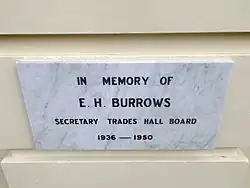 Since its opening in 1934, the Trades Hall Board has been responsible for the management and maintenance of the building. Over its history the board has been served by dedicated (and often longstanding) members who are commemorated by an honour board and photos in the lounge area upstairs. The board has included union delegates who went on to play larger roles in the civic affairs of Toowoomba and Queensland, most notably Jack Duggan, Secretary of the Trades Hall Board and President of TLC who was a longstanding local Labor member for Toowoomba, Minister for Transport (1947–57) and Leader of the Opposition (1958–1966). In December 1958 Duggan (then State Opposition Leader) unveiled a plaque right of the main entrance of the trades hall, to honour EH (Ted) Burrows' service to the trade union movement. Ted Burrows was a member of the Trades Hall Board for 25 years and secretary for 14 years. At the same ceremony a photo of Lesley Wood was hung in the hall. He was the former ALP Member for Toowoomba, Leader of the Opposition prior to Duggan, and had died suddenly in March 1958.[1]