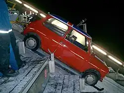 The following day, May, tasked with handling the unmanned Mini's guidance, revealed that the car would need skis for the special groves that would be cut for it on the ski jump they were using. The Rocketry Association, who were working on the Power for the jump (with Clarkson's help), decided to also work on making some custom-made skis for the Mini upon learning of this. Meanwhile, Hammond began work on setting up a barrier to stop the Mini after it made its jump, but after making a clumsy one before the wrong jump, recruited a herd of tractors to set up a wall of hay bales at the bottom of the jump, backed with a large snow bank to ensure the car stopped fully and safely. As night fell, the Mini, now laden with rockets, was carefully put into place on the special groves and winched to the top of the jump, given final checks, and eventually was launched down the jump. Although it failed to beat the skier's distance, the presenters were more than satisfied that the Mini had managed to successfully do the ski jump, which was extraordinary feat in itself.