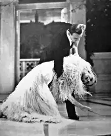 Due to the enormous labor involved in sewing each ostrich feather to the dress, Astaire—who normally approved his partner's gowns and suggested modifications if necessary during rehearsals—saw the dress for the first time on the day of the shoot,[20] and was horrified at the way it shed clouds of feathers at every twist and turn, recalling later: "It was like a chicken attacked by a coyote, I never saw so many feathers in my life."[21][22] According to choreographer Hermes Pan, Astaire lost his temper and yelled at Rogers, who promptly burst into tears, whereupon her mother, Lela, "came charging at him like a mother rhinoceros protecting her young."[23] An additional night's work by seamstresses resolved much of the problem; however, careful examination of the dance on film reveals feathers floating around Astaire and Rogers and lying on the dance floor.[4] Later, Astaire and Pan presented Rogers with a gold feather for her charm bracelet, and serenaded her with a ditty parodying Berlin's tune: