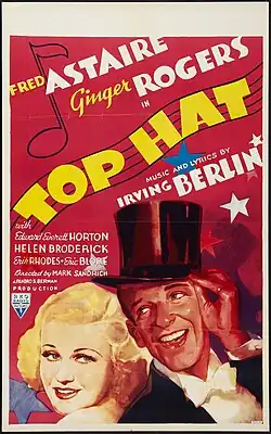 Astaire and Rogers made nine films together at RKO Pictures, including: The Gay Divorcee (1934), Roberta (1935), Top Hat (1935), Follow the Fleet (1936), Swing Time (1936), Shall We Dance (1937), and Carefree (1938). Top Hat was the most successful picture of Astaire and Rogers' partnership (and Astaire's second most successful picture after Easter Parade), achieving second place in worldwide box-office receipts for 1935.[4] While some dance critics maintain that Swing Time contained a finer set of dances,[4][5] Top Hat remains, to this day, the partnership's best-known work.[6]