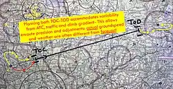 Alternatively, when manual planning and monitoring a VFR flight, TOC is an elegant and efficient way for a pilot to eliminate all the vaguery and variability of departing any airport (the turns assigned, changes of runway the pilot cannot control). TOC establishes a "starting gate" for the en route portion of a flight to allow timing and tracking along the course. A clearly determined TOC is predicated in planning along the intended route of flight far enough from the departure so that the aircraft is at altitude, on course, trimmed up in cruise flight. The variability of departure is now over and accurate tracking and monitoring of progress are beginning.