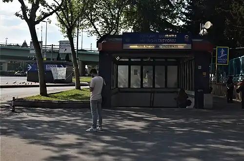 Topkapı-Ulubatlı is an underground station on the M1 line of the Istanbul Metro.[2] It is located in eastern Fatih between the neighborhoods of Karagümrük and Topkapı in Istanbul. An out-of-system transfer to Vatan station on the T4 light-rail line is available as well as connections to İETT city buses. Topkapı-Ulubatlı was opened on 3 September 1989 as part of the first rapid transit line in Istanbul as well as Turkey and is one of the six original stations of the M1 line. The station is right next to the Byzantine-era Theodosian walls of Constantinople. The station gets part of its name from the 15th century soldier, Ulubatlı Hasan who was one of the first Ottoman soldiers to scale the walls during the Fall of Constantinople.