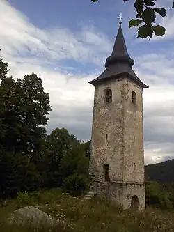 The church in the village was a chapel of ease dedicated to Saints Peter and Paul. It had a rectangular nave and an octagonal chancel walled on three sides. A square belfry stood against the south wall of the building. The church was first mentioned in written sources in 1689 by Johann Weikhard von Valvasor, who referred to it as the Church of "S. Pauli zu Toplaverch." The church was probably built in the 17th century, but architectural features indicate that it may date from a century earlier. The church had a simple stone door casing and small rectangular windows, with quoined corners and decorative painting. The belfry also featured quoining. The nave and the chancel were covered with a tiled gabled roof. The church fell into ruin after the departure of the Gottchee Germans, and the local people removed much of the material, leaving only the belfry, whose roof was repaired in 2004.[4]