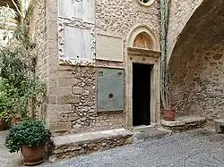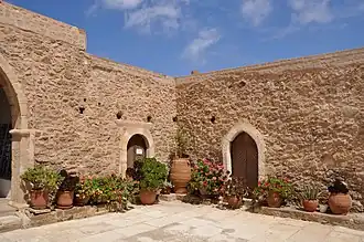 The monastery was founded at a time when the classical city of Itanus, former owners of the promontory, was long gone, abandoned centuries earlier, and forgotten by all except the monks, who continued to be interested in the site. The Ottoman Empire had not yet become ascendant. For reasons unknown or not generally published the monastery inherited the entire territory of the ancient city, which it holds today as a major asset.[2] A corporation has been created for its land holdings, "The Public Welfare Foundation of Panagia Akrotiriani," a subsidiary of the monastery and the Archdiocese of Sitia. The monastery was originally called Panagia Akrotiriani ("Our lady of the Cape)," a name which apparently is still legally meaningful. Its alternative current name, Moni Toplou, literally means "place of the cannon" (Turkish: top), thus called by the Turks for the cannon then mounted over the door.[3] It had that name since at least 1865, when Thomas Abel Brimage Spratt reported on his survey work in Crete, misrepresenting the name as Greek to plou ("the plou," whatever "plou" might be).