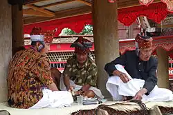 Before the start of the formal administration of Toraja villages by the Tana Toraja Regency, each Toraja village was autonomous. In a more complex situation, in which one Toraja family could not handle their problems alone, several villages formed a group; sometimes, villages would unite against other villages. Relationship between families was expressed through blood, marriage, and shared ancestral houses (tongkonan), practically signed by the exchange of water buffalo and pigs on ritual occasions. Such exchanges not only built political and cultural ties between families but defined each person's place in a social hierarchy: who poured palm wine, who wrapped a corpse and prepared offerings, where each person could or could not sit, what dishes should be used or avoided, and even what piece of meat constituted one's share.[20]