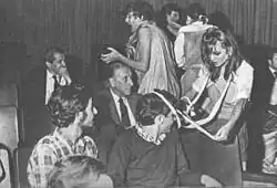 A turn of historical events in 1966 proved detrimental to the institute, and to freedom of expression, when the civilian administration of President Arturo Illia was deposed on June 28 by the Argentine Armed Forces, and was replaced with the head of the Joint Chiefs of Staff, General Juan Carlos Onganía. Moderate in comparison with many of his counterparts in other Latin American nations, Onganía was, however, a member of the right-wing Catholic power group, Opus Dei, and as such, found many of the developments in Argentine culture during the 1960s offensive.[4] Sharing his distaste for modern culture was Luis Margaride, whom he named head of the Federal District Police, and who would be remembered for his crusades against nightclubs, long hair, and miniskirts.[5] Facing a government policy backdrop such as this, numerous avant-garde artists (and others, particularly in academia) left Argentina, many never to return.[6]