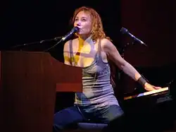 Due to professional conflicts, after working with Atlantic for the first 15 years of her career, Amos decided to seek another label.[20] She joined Epic Records and released three albums over the next five years: Scarlet's Walk in October 2002, The Beekeeper in February 2005 and American Doll Posse in May 2007. On all three albums, Amos performed with Chamberlin on drums, Evans on bass and Mac Aladdin on guitar. Each album debuted in the Top 10 of the Billboard 200,[21][22][23] placing Amos in an elite group of women who have secured five or more Top 10 album debuts.[24] Amos negotiated an end to her contract with Epic following the release of American Doll Posse, announcing in 2008 that she will be operating independently of record labels.[25] In early 2009, Amos signed a distribution, or joint-venture, deal with Universal Republic Records, a division of Universal Music Group, which granted her greater creative control over her work than traditional recording contracts.[26] Amos released two albums her first year under the contract: Abnormally Attracted to Sin in May 2009 and the seasonal album Midwinter Graces, featuring reworked Christmas carols and some original songs, in November 2009. Abnormally Attracted to Sin is Amos's seventh album to debut on the US Top 10 on the Billboard 200.[13] Amos followed up with her first classical music album, Night of Hunters, recorded with Andreas Ottensamer of the Berlin Philharmonic and the award-winning string quartet, Apollon Musagète. Night of Hunters was released in September 2011, through the Deutsche Grammophon label, the classical music division of Universal Music Group. With Night of Hunters, Amos made Billboard history by being the first female artist to have an album place in the Top 10 of the Classical, Alternative, and Rock charts simultaneously.[27]